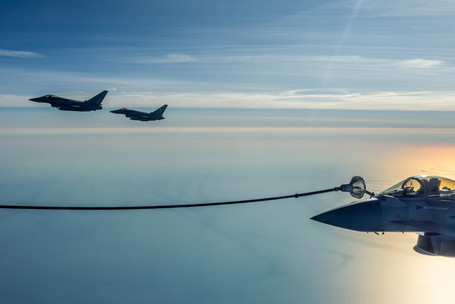 The A330 MRTT flew a track over the Dutch Wadden islands and the Danish coastline. Receivers during the mission were four RNLAF F-35A's, flying out of Leeuwarden and four RAF Typhoons, flying out of RAF Lossiemouth.