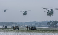 The Germans participated with two NH-90TTH helicopters from THR 10 Faßberg and THR 30 Niederstetten, operating from Gilze-Rijen airbase together with the Dutch helos. On the first day three CH-47 Chinooks, two AS-532U2 Cougar and two NH-90 TTH helicopters participated picking up their loads in three rounds both in the afternoon and at night. On the second day one German helicopter had technical problems and could not particpate. Again three loads were flown in the afternoon from Deelen airbase to the landing zone at the Edese heath and back at night.